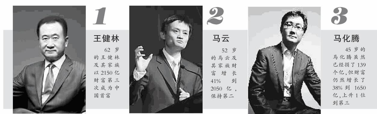 10月13日,胡润研究院宣布《2016碧桂园森林都会· 胡润百富榜》,这是胡润研究院自1999年以来连续第18次宣布“胡润百富榜”。今年百富榜上榜门槛已连续四年坚持20亿元。王健林以2150亿财产第三次成为中国首富,马云则以2050亿的财产位列第二。